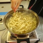 今日は、小麦粉をこねて、足で踏んで、ねぎやかまぼこを切って、油揚げ、天かすなどを加えて、一生懸命、細く切ってうどんを作りました。美味しかったです。